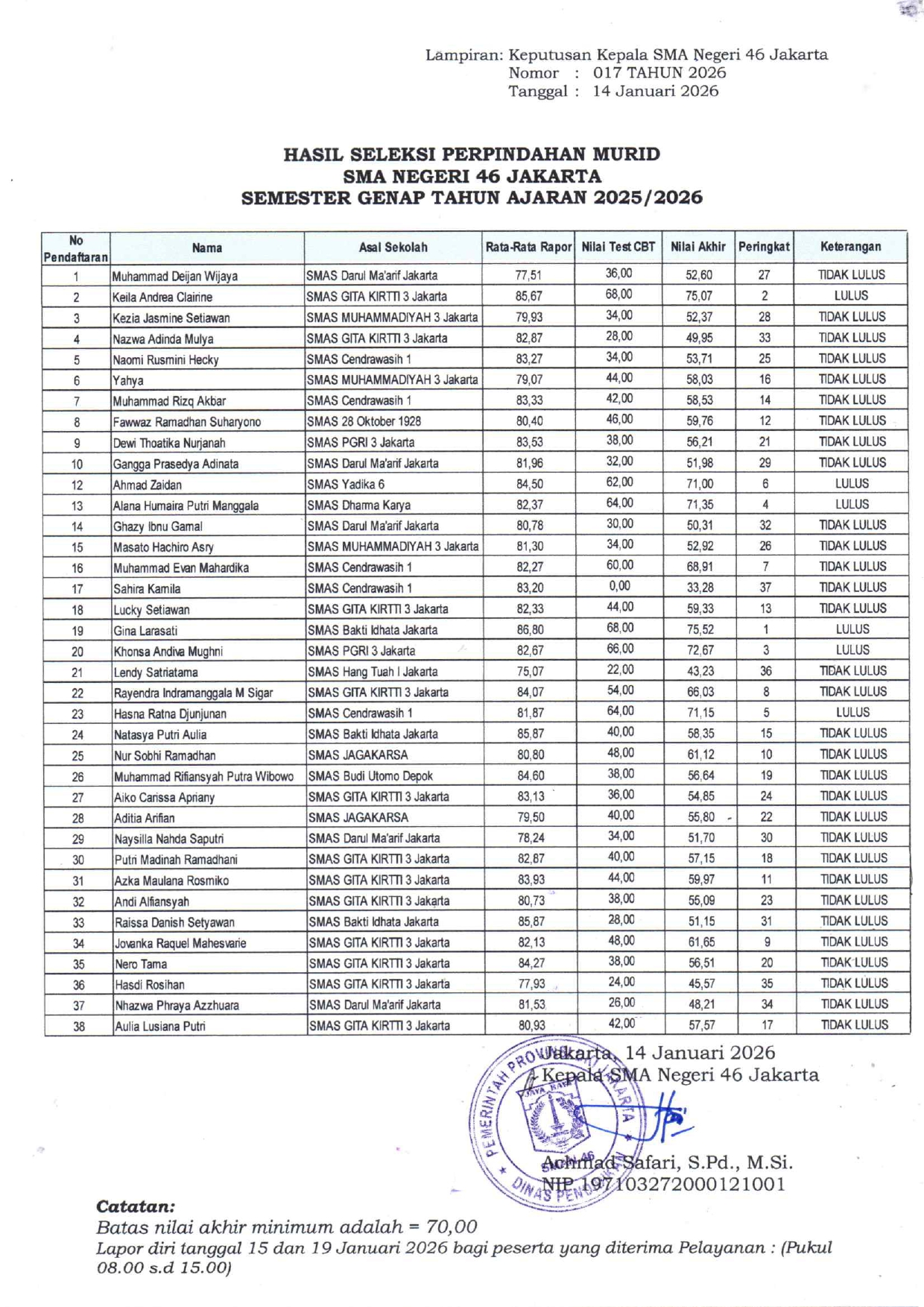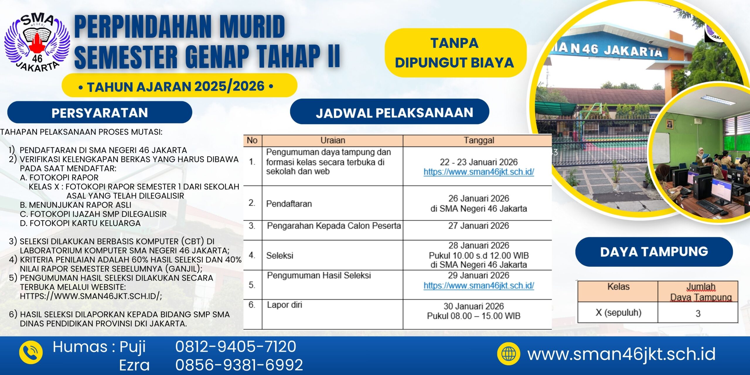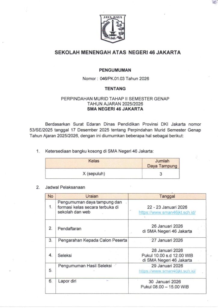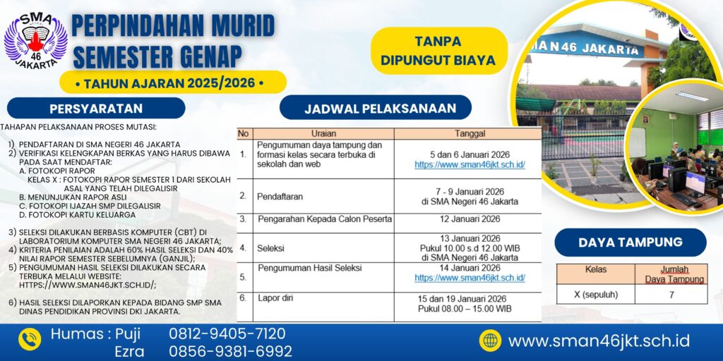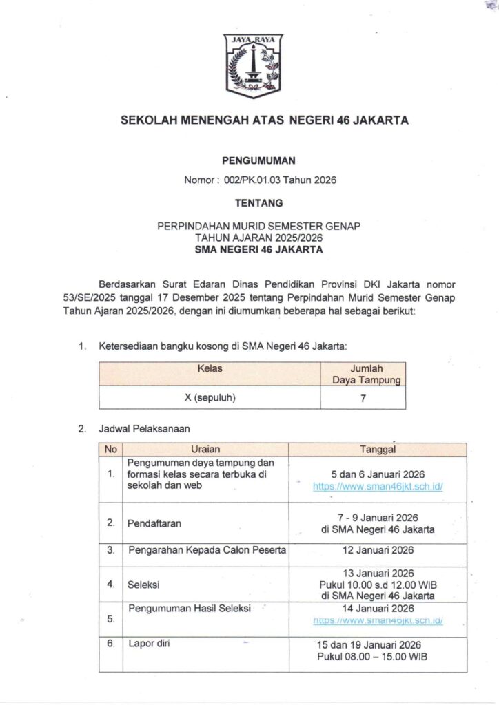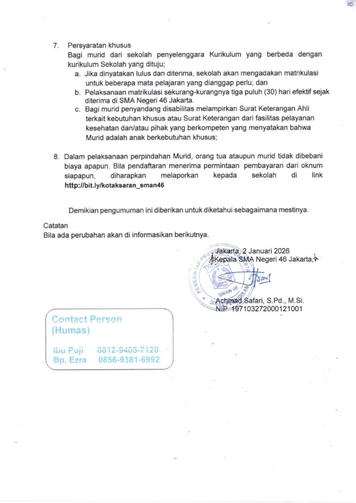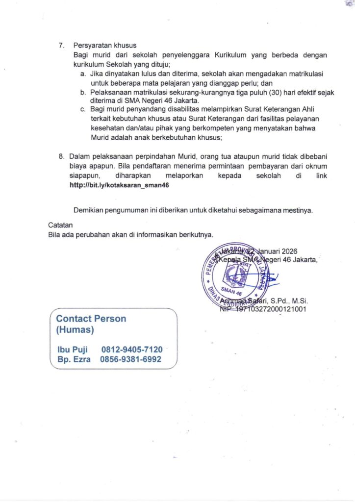 Wassalamu’alaikum warahmatullahi wabarakatuh. Jakarta, 5 Mei 2025 Hormat kami, Kepala Sekolah SMA Negeri 46 Jakarta Achmad Safari, S.Pd., M.Si